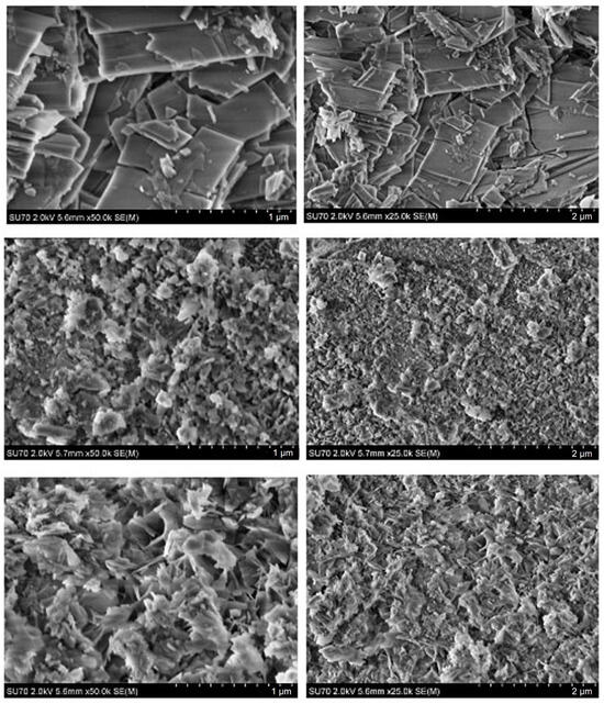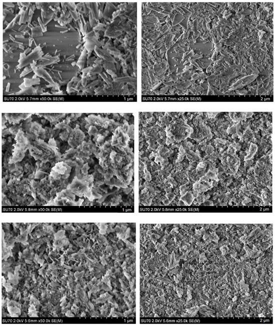SEM micrographs obtained at different magnifications of the CHA samples synthesized from phosphogypsum dried at 150 °C and reacted with different phosphorus sources: Na2HPO4 (bottom), Na2HPO4 + NaH2PO4 (middle), and Na2HPO4 + NaH2PO4 + NaHCO3 (top). The synthesis procedure was carried out for 144 h.