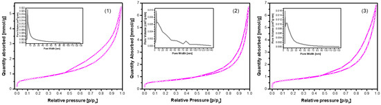 N2 adsorption–desorption isotherms of the CHA samples synthesized via the dissolution–precipitation method from phosphogypsum dried at 100 °C and reacted with Na2HPO4 (1), phosphogypsum dried at 150 °C and reacted with Na2HPO4 (2), and phosphogypsum dried at 150 °C and reacted with a mixed solution of Na2HPO4 + NaH2PO4 + NaHCO3 (3). The synthesis procedure was carried out for 144 h. The inset shows the pore size distribution.