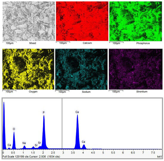 In all cases, EDX elemental mapping demonstrates that all elements appear to be homogeneously distributed throughout the samples despite the differences in their preparation. The molar ratio of Ca and P in most of the cases corresponds to a ratio 1.67, which is characteristic of the ratio of these elements in calcium hydroxyapatite. A negligible amount of sodium (remaining from starting reagents) and strontium (initial presence in phosphogypsum waste) was also determined in the end products by EDX analysis. Since we did not observe Ca-rich, P-rich, or other metal-rich regions, we can conclude that the almost monophasic CHA could be fabricated by using the dissolution–precipitation synthesis method from phosphogypsum waste.