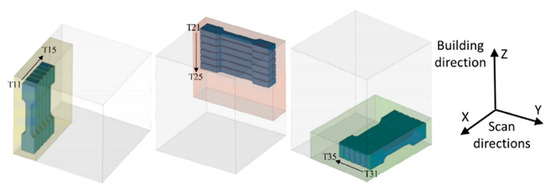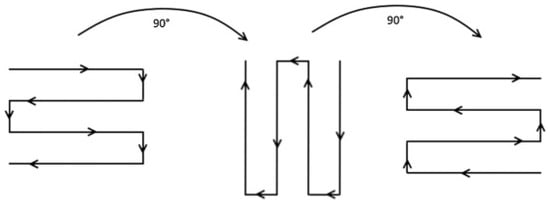 To optimize the mechanical properties of the fabricated components, electron beam melting (EBM) was employed using a distinct three-layer scanning pattern. The scanning pattern is depicted in Figure 3, where red arrows indicate the specific scanning strategy implemented. To investigate the influence of build direction on material properties, samples were fabricated in two different orientations, as illustrated.