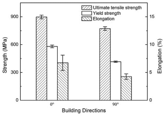 The mechanical properties of DED-fabricated 316L stainless steel alloy are analyzed at both 0° and 90° orientations (sourced from publisher under permission) [49].