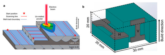 Electron beam melting (EBM) scanning strategy (a) and build orientations for 316L stainless steel: horizontal and vertical build directions (b) (sourced from publisher under permission) [97].