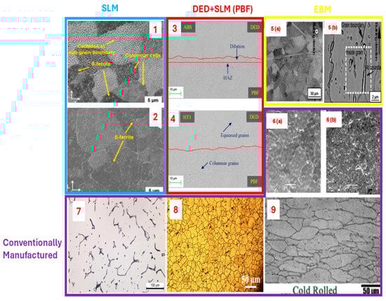 The mechanical properties of 316/316L stainless steel are highly influenced by the selected additive manufacturing (AM) technique and its process parameters. This section compares selective laser melting (SLM), Directed energy deposition (DED), and electron beam melting (EBM), emphasizing the distinct characteristics of each method. It provides a detailed assessment of how their unique operational parameters shape the microstructure and overall performance of stainless steel alloys, offering valuable insights into their suitability for various applications [16]. This comparative analysis highlights key differences in process conditions, powder delivery methods, and preheating requirements, while also addressing defect mitigation through post-processing strategies—factors that play a crucial role in determining the final material properties. Each of the AM techniques operates differently, utilizing distinct energy sources—DED and SLM rely on lasers, while EBM uses an electron beam. Their power capacities also vary significantly, with DED operating at around 500 W, SLM at a lower 120 W, and EBM reaching up to 3500 W. Additionally, the beam sizes differ across these methods, affecting precision and material deposition. DED has a broader beam range of 660 to 900 µm, SLM features a much finer beam of 30 to 250 µm, and EBM falls between 200 and 1000 µm. Another key difference lies in preheating requirements, which play a crucial role in material properties and defect mitigation. DED requires the build plate to be heated between 200 °C and 500 °C, whereas SLM operates at lower preheating temperatures of around 100–200 °C. In contrast, EBM demands significantly higher preheating, typically around 700 °C, which helps in reducing residual stresses. Scanning speed also varies among these techniques—DED operates at a slower rate of 0.001 to 0.04 m/s, while SLM moves at a moderate pace of 0.3 to 1 m/s. EBM, however, achieves much higher speeds, often exceeding 1000 m/s, making it ideal for applications requiring rapid production. The thickness of each deposited layer further differentiates these processes. DED builds thicker layers ranging from 200 to 1000 µm, whereas SLM achieves finer layer deposition between 20 and 100 µm, and EBM falls in between, with layer thicknesses from 50 to 200 µm [32,33,34,35,36,37,38,39,40].