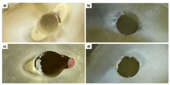 Failure mode: (a) type 1 (adhesive 1)—failure between the fiber post and the cement; (b) type 2 (adhesive 2)—failure between the dentin and the cement; (c) type 3 (cohesive)—failure within the cement; (d) type 4 (mixed)—a combination of different failure types.