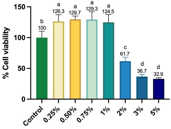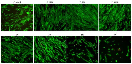 The Live/Dead assay (Figure 3) showed that the cells remained viable after 24 h of treatment with Aloe vera solutions at concentrations of 0.25%, 0.5%, 0.75%, 1%, and 2%, displaying a high number of live cells (stained green) and few or no dead cells (stained red). Furthermore, these concentrations allowed the cells to maintain a morphology similar to that of the control group. Higher concentrations (3% and 5%) exhibited fewer adhered cells, reducing cell viability. Additionally, the 5% concentration induced the cells to organize into clusters, with dead cells (red staining).