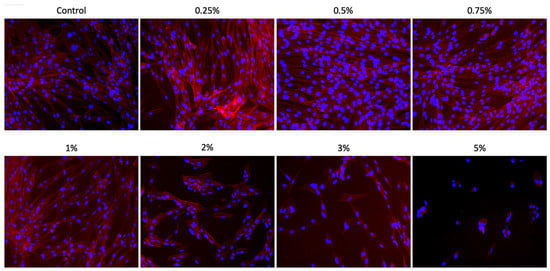 Cell adhesion/spreading assay. Representative images (20× 100 μm) of SCAPs cultured with different concentrations of Aloe vera (0.25%, 0.5%, 0.75%, 1%, 2%, 3%, and 5%) for 24 h. Blue staining = nuclei; red staining = F-actin filaments.