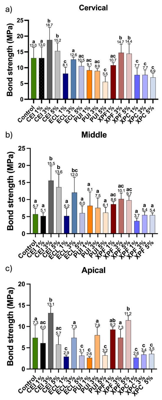 Representative graph of the maximum tensile strength (MPa) in the (a) cervical, (b) middle, and (c) apical third of the root. Different letters indicate statistically significant differences between groups (one-way ANOVA; Tukey’s post hoc test, p < 0.05; n = 10/group).