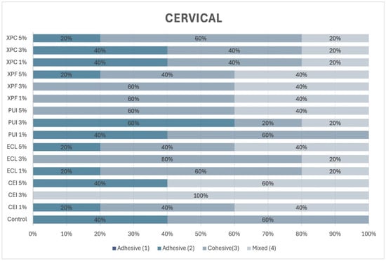 In the cervical third of the root (Figure 6), cohesive failures were predominant regardless of the group or the concentration of Aloe vera. Adhesive failure was observed exclusively in the control group.