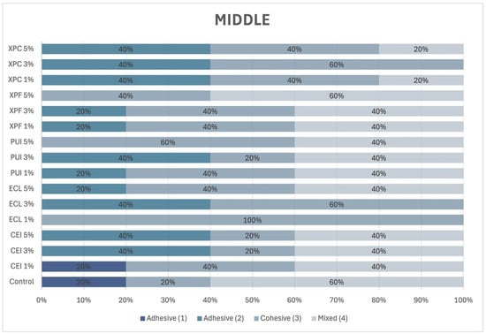 In the middle third of the root (Figure 7), a predominance of mixed failure was observed regardless of the concentration of Aloe vera. A similar incidence of adhesive and cohesive failures was observed in the XP Endo Finisher group.