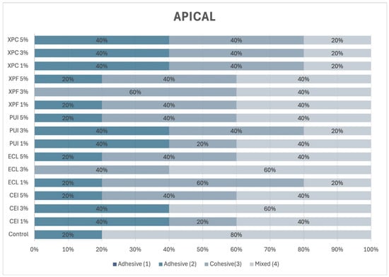 In the apical third of the root (Figure 8), a predominance of mixed failure was observed regardless of the concentration of Aloe vera. Only in the XPF group, at all the tested concentrations, and in the PUI 3% and ECL 3% groups, were adhesive and cohesive failures observed with comparable frequency.