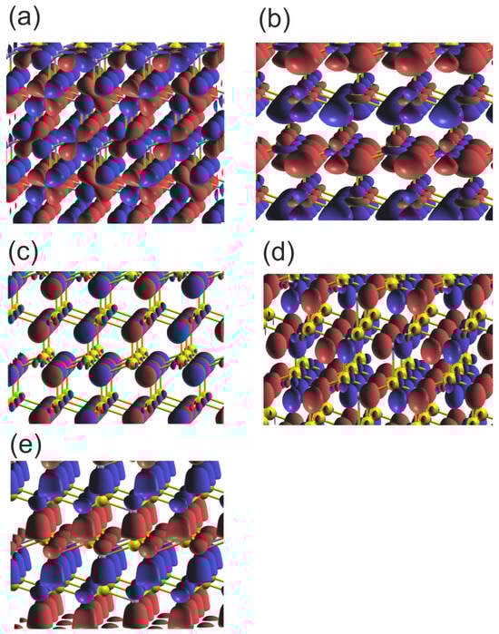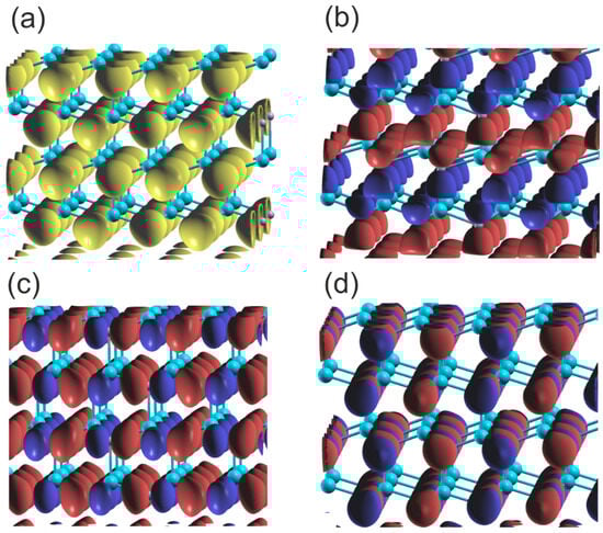 As can be seen, the two VB subbands are formed: the lower one due to N2s and Ga3d orbitals, and the upper one related to -hybridized Ga and N2p orbitals. The subbands are separated by a 4 eV gap, which is comparable to the GaN bandgap. These results are fully compatible with the experimental data obtained by Magnuson for GaN [24]. The overlap is predominantly positive, with a small contribution from the N2s and Ga3d overlaps. In the upper VB subband, the higher part is dominated by Ga4pxy orbitals, as known from other -hybridized semiconductors. This is confirmed by the plots of the real part of the wavefunction in the GaN lattice at Γ point, shown in Figure 6. As shown in Figure 6a,b, the wavefunctions of the N2s state are distorted, showing considerable overlap with the Ga3d states. Again, the states N2p are asymmetric and directed towards the Ga atoms, which confirms the overlap with the neighboring Ga orbitals in the upper VB subband. Thus, the resonant bonding in the upper VB subband is confirmed. The Bader charges for the metal–nitrogen charge transfer are reduced, as compared to the previous cases: which confirms smaller electron shift to N orbitals.