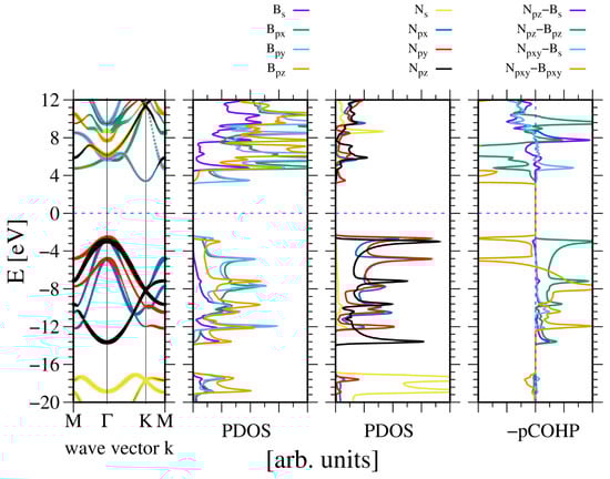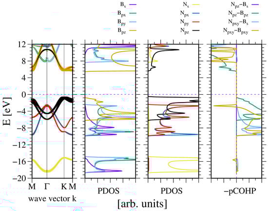 Electronic properties of periodic hexagonal boron nitride (h-BN). The panels represent, from the leftmost: band diagram, projected density of states (PDOS) of the B (left) and N (right) atoms; and the rightmost panel—Crystal Orbital Hamilton Population (COHP) [49,50]. The COHP data correspond to the pair of nearest neighboring N and B atoms. The color codes are the same for the PDOS and the band diagram. The Fermi energy is set to zero. Positive COHP values correspond to the bonding overlap.