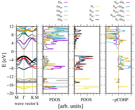 The electronic properties of bulk wurtzite gallium nitride (GaN). The panels represent, from the leftmost: band diagram, projected density of states (PDOS) of the Ga (left) and N (right) atoms; and the rightmost panel—Crystal Orbital Hamilton Population (COHP) [49,50]. The COHP data correspond to the pair of nearest neighboring N and Ga atoms. The color codes are the same for the PDOS and the band diagram. The Fermi energy is set to zero. Positive COHP values correspond to the bonding overlap.
