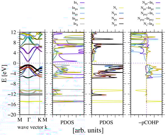 Electronic properties of the bulk wurtzite indium nitride (InN). The panels represent, from the leftmost: band diagram, projected density of states (PDOS) of the In (left) and N (right) atoms; and the rightmost panel—Crystal Orbital Hamilton Population (COHP) [49,50]. The COHP data correspond to the pair of nearest neighboring N and In atoms. The color codes are the same for the PDOS and the band diagram. The Fermi energy is set to zero. Positive COHP values correspond to the bonding overlap.