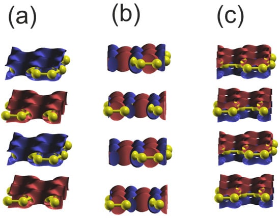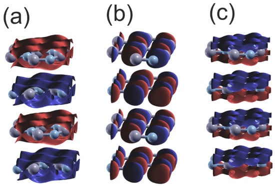 Plot of the real part of the wavefunctions (Re) of the orbitals of the upper and lower VB of hexagonal BN at Γ point: (a) orbital N2s ; (b) orbital N2py ; (c) orbital N2pz . The colors represent the positive and negative parts of the function of N2p orbitals; in the case of 2Ns orbitals only the single part is present, and the sign changes for the different layers. The gray and bluish–gray balls represent B and N atoms, respectively.