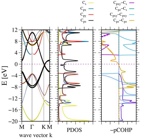 The electronic properties of AB stacked graphene. The panels represent, from the (leftmost): band diagram, projected density of states (PDOS) of the C atom (middle); and the (rightmost) panel—Crystal Orbital Hamilton Population (COHP) [49,50]. The COHP data correspond to the pair of nearest neighboring N and B atoms. The color codes are the same for the PDOS and the band diagram. The Fermi energy is set to zero. Positive COHP values correspond to the bonding overlap.