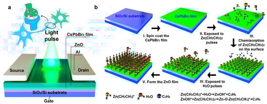 In the human brain, synapses serve as connections between neurons. Presynaptic neurons respond to stimuli and then release neurotransmitters that bind to receptors in postsynaptic neurons [2,3]. Similar to synapses in the human visual system, photoelectric synaptic transistors can convert received optical signals into electrical signals. Figure 1a shows the schematic structure of the island-like CsPbBr3/ZnO hybrid synaptic transistor. The island-structured CsPbBr3 film on the SiO2/Si substrate acts as the light-absorbing layer, while the ZnO layer deposited in the gaps between the CsPbBr3 islands acts as the charge transport layer. The fabrication process flow of the CsPbBr3/ZnO hybrid film is shown in Figure 1b. Initially, the CsPbBr3 film was fabricated on the SiO2/Si substrate via the process of spin-coating. Then, ZnO was deposited on the surface of the CsPbBr3 film by ALD. The ALD process used DEZ as the metal precursor and H2O as the oxidant precursor. Considering the sensitivity of perovskite materials to factors such as moisture and oxygen, the DEZ precursor was first introduced to adhere to the surfaces of the CsPbBr3 and the substrate. The excess DEZ was then purged using a nitrogen gas flow. The H2O precursor was then introduced to chemically react with the DEZ on the surfaces to form ZnO. By controlling the number of DEZ/H2O precursor cycles, the desired thicknesses of the ZnO films were achieved.