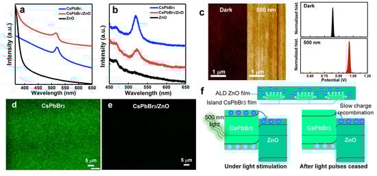 (a) UV-Vis and (b) PL spectra of CsPbBr3, ZnO, and CsPbBr3/ZnO films, respectively. (c) Surface potential of the CsPbBr3/ZnO film under 500 nm light and dark. Microscope images of (d) CsPbBr3 and (e) CsPbBr3/ZnO films under blue light. (f) Energy-band diagram of hybrid device under 500 nm light illumination and after light pulses ceased.