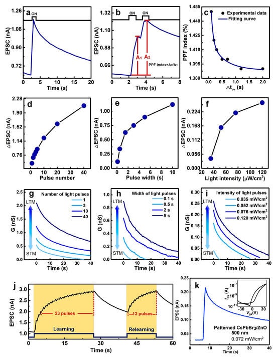 where A1 and A2 represent the ΔEPSC values of the first and second pulses, respectively. Figure 4c illustrates the PPF index decreasing following an exponential decay as Δtpre increases. Additionally, the EPSC of the device could be adjusted via the parameters of the light pulses, such as the number, duration, and intensity (Figure 4d–f). In Figure 4d, it can be observed that when the number of light pulses was less than 10, there was a significant increase in the ΔEPSC. However, as the number of pulses continued to increase, the rate of the enhancement slowed down. This phenomenon may be related to the saturation of the light absorption in the material [14]. Similar trends in ΔEPSC were also observed with increasing light pulse width and light intensity (shown in Figure 4e,f). As shown in Figure S5, the α was obtained at lower than 1 from the fitted line following the power-law, suggesting the obvious photogating effects for the enhancement of the photocurrent [30]. Synaptic plasticity is divided into STP and LTP based on its duration [31]. Similarly, memory retention is broadly divided into short-term memory (STM) and long-term memory (LTM), with LTM resulting from the transition of STP to LTP [31]. Repeated stimulation can convert STP into LTP, which is critical for learning and memory. For the synaptic device, the channel conductance (G) can be regarded as an analogue for memory retention. Figure 4g–i depict the effects of the properties of light pulses on G based on the level of memory. As shown in Figure 4g, G decays more slowly as the number of applied light pulses applied increases (1, 3, 10, and 40 pulses), reflecting the prolonged retention of memory in the human brain. Similarly, increasing the pulse duration (Figure 4h) and light intensity (Figure 4i) facilitated the transition from STM to LTM. These results demonstrate the device’s ability to emulate synaptic learning rules and forgetting behaviors, exhibiting the potential to be of use in the future of neuromorphic computing. Figure 4j illustrates the hybrid photoelectric synaptic transistor that mimicked the human repetitive learning–forgetting process. The number of light pulses is analogous to the number of learning repetitions. During the initial learning phase, 25 light pulses (pulse width of 0.5 s, Δtpre of 0.5 s) were applied to trigger the CsPbBr3/ZnO hybrid channel, which significantly increased the EPSC amplitude, corresponding to improved memory retention after 25 learning cycles. Over time, the EPSC spontaneously decayed to a specific level, simulating the forgetting process. In the second learning phase, only 12 light pulses, fewer than the 23 pulses required in the first phase, were needed to restore the EPSC to its initial level. This mirrors the human brain’s ability to relearn forgotten information with fewer repetitions. Additionally, the low quiescent current in devices when there is no input signal is essential for synaptic devices. Figure 4k shows the transfer characteristic curves of a patterned CsPbBr3/ZnO hybrid transistor. Using a probe, the CsPbBr3/ZnO film was mechanically patterned with dimensions of ~500 μm × 500 μm. This device exhibited a significant increase in the on/off current ratio of 104 accompanied by a narrower hysteresis window. Notably, it can be observed that there is a reduced off-state current of the patterned transistor (down to ~10−11 A) compared with that of the non-patterned device (~10−9 A). The lower off-state current is beneficial for optimizing the quiescent current. The EPSC of this patterned CsPbBr3/ZnO hybrid transistor under a 500 nm light pulse has a low quiescent current of 0.025 nA and exhibits a markedly slower decay than that of the non-patterned device. This difference likely arose because the patterning of the composite film suppresses fringe effects [32], highlighting the necessity of patterning hybrid films for advanced synaptic functionality. The comparison in Table S1 represents that the quiescent current for island-like CsPbBr3/ALD ZnO hybrid transistors, especially for patterned devices, is lower than those of most other photoelectric synaptic devices in previous studies. However, the EPSC amplitude shows no significant increase. This may require future studies to focus on interface optimization and performance enhancement of the zinc oxide transport layer, aiming to improve photogenerated carrier extraction.