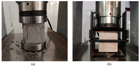Static mechanics experimental setup. (a) Static uniaxial compressive test; (b) static split tensile test.