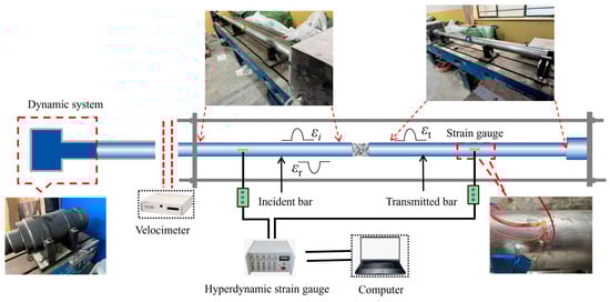 The SHPB test system is a classic apparatus for studying the dynamic mechanical properties of quasi-brittle materials such as rock and concrete, effectively simulating material response behavior under high strain rates from explosive impact loads. This test used a Φ75 mm SHPB device (as shown in Figure 4), which mainly consists of a launching power unit, incident bar, transmission bar, absorption bar, and dynamic strain measurement system. The bar material was high-strength alloy steel with a density of 7850 kg/m3, elastic modulus of 210 GPa, and Poisson’s ratio of 0.3, resulting in a calculated longitudinal wave velocity of 5173 m/s. Both the incident and transmission bars were 2 m in length, satisfying the long bar assumption conditions of one-dimensional stress wave theory. The dynamic loading system employed an improved spindle-shaped striker, generating a half-sine wave incident stress wave through pneumatic drive. When the stress wave propagated along the incident bar to the specimen interface, part of the energy formed a reflected wave returning to the incident bar, while the other part passed through the specimen forming a transmitted wave entering the transmission bar. During signal acquisition, resistance strain gauges (CH1, CH2) were symmetrically attached to the middle of the incident and transmission bars, and strain signals were synchronously collected through an ultra-dynamic strain gauge. After wave processing, the time–history curves of incident, reflected, and transmitted waves were obtained. Through the “three-wave method,” [31] the average stress, average strain , and average strain rate of the concrete specimens were obtained, with calculation formulas as shown in Equations (1)–(3):