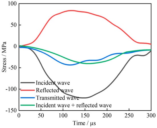 The stress uniformity of the specimen during loading is a prerequisite for the validity of the test [32]. The strain–time course curve under typical impact air pressure is selected for balance verification, as shown in Figure 5. The sum of the strain signals from the incident wave and reflected wave overlaps well with the transmitted wave strain signals, demonstrating that the specimen is dynamically balanced at both ends [33]. This observation suggests that the experimental results are valid.
