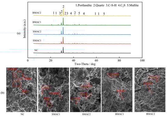 Comparing the microstructural composition of HC, FHC1, and FHC2 (Figure 6a), the content of quartz and mullite shows a progressive upward trend. This is primarily due to the characteristics of fly ash, where during the hydration and hardening process of concrete, some alumino-silicate compounds in fly ash gradually transform to form mullite phases. Meanwhile, the diffraction peak intensity of calcium hydroxide significantly decreases because fly ash reacts with calcium hydroxide in a secondary hydration reaction. Calcium hydroxide, as a key reactant, is largely consumed to produce more stable products such as calcium silicate hydrate (C-S-H) gel [36]. When both fly ash and slag powder are simultaneously added to concrete, the diffraction peak intensity of dicalcium silicate (C2S) further increases. This occurs because slag powder works synergistically with fly ash, with its active components participating in secondary hydration, providing additional silicon and aluminum components, further optimizing the formation and structure of C-S-H gel [37].