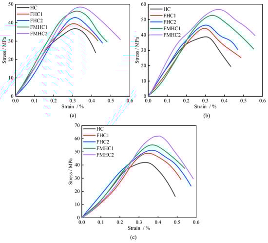 - The synergistic effect between slag powder and fly ash further optimizes the gel system structure, thereby comprehensively enhancing the stability of concrete’s internal microstructure. Concrete specimens incorporating binary mineral admixture demonstrate higher peak stresses in static compression tests and exhibit greater slopes during the elastic phase of splitting stress–strain curves. Compared to HC, the FHC1, FHC2, FMHC1, and FMHC2 specimens show respective increases of 10.11%, 11.75%, 18.63%, and 25.52% in average axial compressive strength, along with corresponding improvements of 1.40%, 5.61%, 11.58%, and 18.95% in average splitting tensile strength.