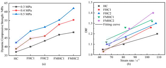 Dynamic compressive strength of different test specimens. (a) Dynamic compressive strength; (b) dynamic growth factor.