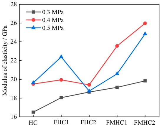 Figure 8 shows the stress–strain curves of each specimen under 0.3–0.5 MPa impact air pressure. Under the fixed impact load condition, the peak stresses of the specimens showed a significant increasing trend as the admixture approach transitions from non-admixture to single admixture, and further to binary admixture. Specifically, under the impact load of 0.3 MPa, the peak stresses of the specimens with different combinations of mineral dopants were 37.08 MPa, 40.05 MPa, 43.41 MPa, 46.92 MPa, and 48.31 MPa, and the strengths of the specimens with different combinations of mineral dopants were 8.01%, 17.07%, 26.54%, and 30.28%, respectively, compared with those of the HC specimens. FHC1, FHC2, FMHC1, and FMHC2 specimens, respectively, compared with the peak stress of HC specimens. The linear elastic phase characteristics of the stress–strain curves indicated that the dynamic modulus of elasticity showed a significant increasing trend with the improvement of the mechanical properties of concrete, with the steepness of the curve for the specimens with compounded mineral admixtures being particularly obvious. Under the influence of different impact loads, the peak stress increases with the increase in impact load. Taking HC specimens as an example, the peak stresses increased by 4.75% and 14.27% in the impact load variation interval from 0.3 to 0.5 MPa, respectively. When the impact load reaches 0.4MPa, the plastic deformation stage of each specimen begins to show a small expansion; when the load is further increased to 0.5MPa, the time for the specimen to reach the peak stress is significantly shortened, and the stress–strain curve rapidly transitions from the elastic stage to the plastic flow stage.