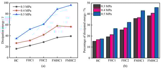 Energy characteristics of different concrete specimens. (a) Dissipated energy; (b) percentage of dissipated energy.