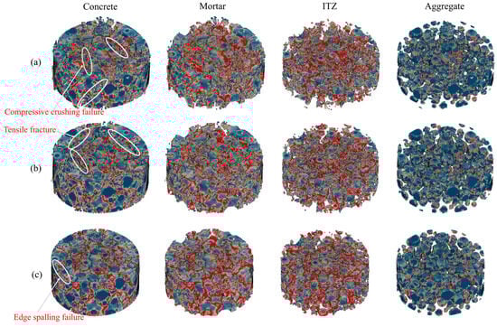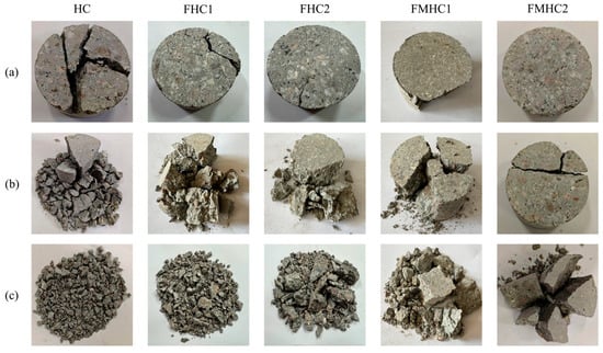 Compression damage patterns of different specimens. (a) HC; (b) FHC1; (c) FMHC1.