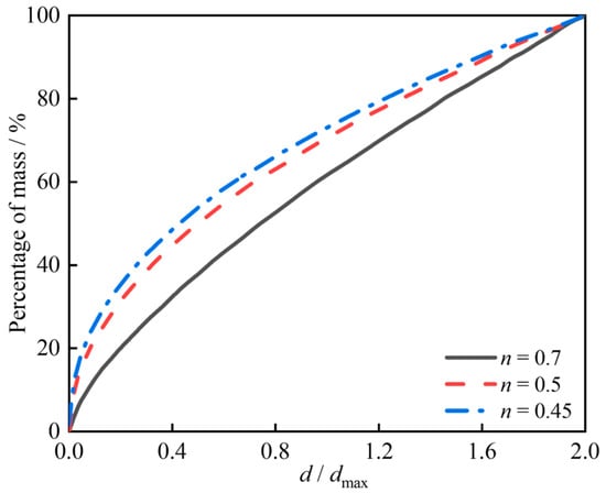 where represents the percentage of aggregate with particle size smaller than ; is the maximum aggregate size; is an empirical parameter. Following the aggregate gradation determination method in the reference [41], a gradation curve where is selected to determine aggregate content, as shown in Figure 13. Continuous gradation can be divided into different particle size grade ranges, and the proportion of coarse aggregates in different grade ranges can be calculated using Equation (10).
