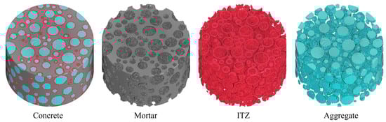 Based on the mapping projection meshing algorithm [42], the mesh generation process for the mesoscale concrete model is implemented through the following procedures: Initially, on the ANSYS 19.0 preprocessing platform, the explicit dynamic element Solid164 is employed to discretize the concrete specimen into hexahedral mapped meshes, establishing a homogenized grid model that is subsequently exported in K-file format compatible with LS-DYNA. Subsequently, within the Visual Studio integrated development environment, a Fortran program is developed to synergistically process the homogenized mesh K-file and the data file containing aggregate particle sizes and centroid coordinates. The computational workflow comprises two principal phases: First, adaptive adjustment of node/element numbering formats in the original data files is performed according to Fortran’s array indexing rules. Second, a meso-component identification algorithm is implemented to project geometric definitions of aggregates, mortar, and interfacial transition zones onto the predefined homogenized mesh model through point-by-point determination of element material attributes. Figure 14 illustrates the mesoscale aggregate concrete model constructed using three-dimensional mapping meshing technology. As demonstrated in the figure, the model exhibits excellent mesh uniformity, effectively mitigating potential simulation inaccuracies caused by mesh quality issues.