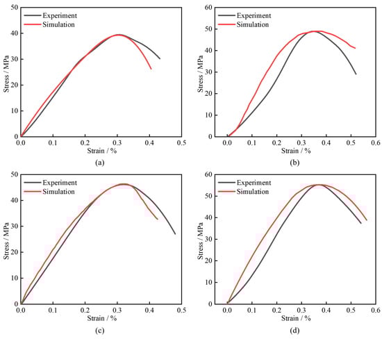 Comparison of the curves between the experiment and the simulation. (a) FHC1-0.3 MPa; (b) FHC1-0.5 MPa; (c) FMHC1-0.3 MPa; (d) FMHC1-0.5 MPa.
