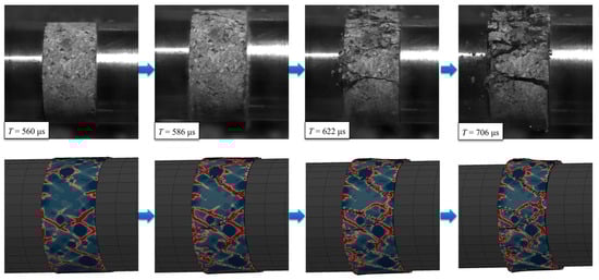 Figure 17 illustrates the typical failure process of specimens under dynamic impact compression simulation. Comparative analysis demonstrates good agreement between the simulated and experimental failure processes. The established mesoscopic concrete model effectively simulates both dynamic mechanical properties and failure characteristics of concrete specimens. These findings confirm the feasibility of the mesoscopic concrete modeling method and validate the numerical simulation results.