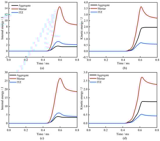 Comparative analysis of energy time–history curves for meso-scale structures in FHC1 and FMHC1 specimens (Figure 19) yields the following conclusions: At 0.4 ms, the incident stress wave reaches the specimen boundary, activating the material’s energy absorption mechanism. Analysis of internal energy evolution curves demonstrates that the mortar matrix attains the highest internal energy peak, followed by the ITZ, with aggregate particles exhibiting the lowest values. Kinetic energy time–history curves reveal analogous trends: the mortar matrix displays the most pronounced kinetic energy response, succeeded by aggregate particles, while the ITZ shows minimal kinetic energy increment. These findings confirm that the mortar matrix and ITZ act as primary energy dissipation carriers under dynamic loading. Their distinct energy absorption characteristics dictate crack propagation paths predominantly concentrated in these regions. In contrast, aggregate particles exhibit weaker internal energy absorption capacity, corresponding to relatively limited damage development.