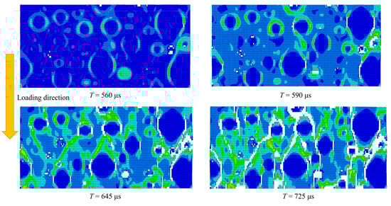 Quantitative analysis of mesoscale structure energy distribution through simulation reveals the following hierarchy: mortar matrix > ITZ > aggregate. This conclusion explains how mortar and ITZ structures effectively alleviate stress concentration at aggregate interfaces under dynamic loading conditions while identifying key failure mechanisms [31]. Damage evolution analysis of concrete cross-sections demonstrates that under impact loading (Figure 20), specimen damage initiates with stress concentration at weak aggregate interfaces. Initial damage occurs in ITZ regions and then propagates along loading directions. Continuous cracks form when ITZ connects with mortar [24]. The binary mineral admixture effectively enhances bonding performance between aggregates and mortar in concrete, improving impact resistance and validating the core findings of this study.