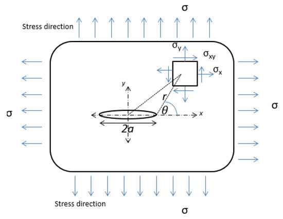 To simulate the Guxian dam, different plates dimensions with the same material properties of the Guxian dam were utilized to assign the safety monitoring index. Fracture mechanics describes the behavior of solids or structures with geometric discontinuities at the structural scale, combining crack mechanics and material properties []. Various techniques analytically solve the stress, strain, and displacement fields near a crack in an elastic solid. The stress function is shown in Figure 1. The stress intensity factor (K) quantifies the stress at the crack tip, calculated using limit value formulas derived from stresses or displacements near the crack tip, often through extrapolation []. K predicts the stress state around the crack tip due to remote loads or residual stresses. It depends on the applied stress, crack size, and geometry, and varies with the crack opening mode, as demonstrated by Equation (5):