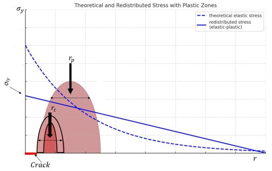 where Kapp represents the stress intensity due to the applied stress, and σty is the material’s tensile yield strength. For the actual plastic zone size to match the theoretical prediction, the stresses within the plastic zone must exceed the yield strength. However, because the material cannot sustain significantly higher stresses, the stress near the crack tip redistributes to regions further away. As a result, the actual plastic zone is approximately twice the theoretical size, or about (2rt). Figure 2 shows the theoretical elastic stress, plastic zone size, redistributed stresses, and the realistic estimate of the plastic zone size. When yielding occurs, stresses redistribute to maintain equilibrium. In the plastic zone, replacing the elastic stress distribution with the constant yield stress disrupts the equilibrium along the y-direction.