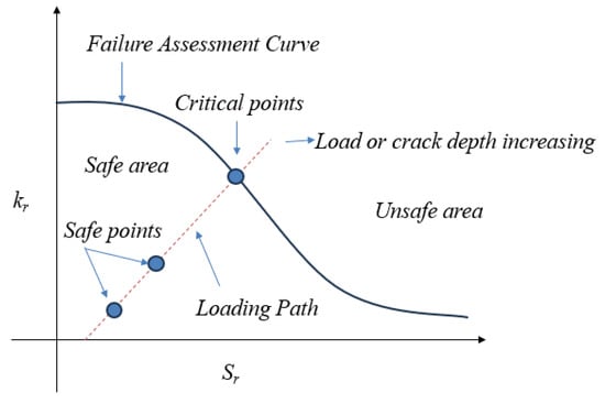 where σapp represents the applied stress, Kapp is the stress intensity factor at the applied stress, σty is the material’s tensile yield strength, and KIC is the material’s plane–strain fracture toughness. To determine the factor of safety, a line (referred to as the load line) is drawn from the origin through the design point, continuing until it intersects the FAD failure locus, see Figure 3. The factor of safety is defined as the ratio of the length of the load line between the origin and the failure point to the length of the load line between the origin and the design point as shown in the following equation. The FAD failure locus is expressed as follows: