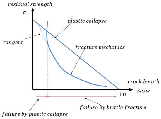 When this occurs, fracture will occur regardless of the fracture toughness since the plastic deformation becomes unbounded. Thus, plastic collapse and brittle fracture are the two potential failure modes. A collapse will occur if the fracture stress σc is greater than the stress that causes failure by collapse. Consequently, for σc and σpc, the real residual strength is the lowest. In the event of a center cracked panel, a plastic collapse failure would occur in three different scenarios: The width W is very small, the crack is very small, and the toughness is very high. Figure 4 shows a sketch for the potential failure modes. The two curves’ intersection is given in Equation (18):