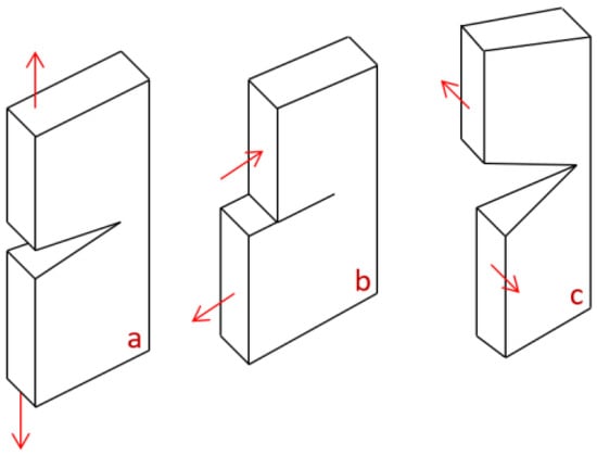 The three basic modes of crack extension: (a) opening mode, (b) sliding mode (in plane shear), and (c) tearing mode (out of plan shear).