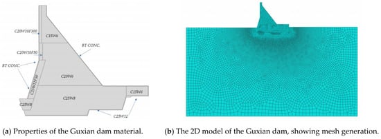 The safety index for the Guxian dam was evaluated using a 2D model with a FEM analysis conducted in ABAQUS 6.14. The assessment considered both scenarios with and without the weak layers present in the RCC dam. This study investigated the impact of weak interfaces on the long-term safety of the Guxian high concrete gravity dam. To track the safety variations during the dam’s progressive failure, the strength reduction method was applied as an indicator to analyze dam displacement and the connectivity of yield zones. Material strength deterioration is identified as one of the most critical factors affecting dam stability. Therefore, the strength reduction method offers an effective approach to understanding the failure process of high concrete gravity dams under this adverse condition. The factor of safety is calculated in the normal case of loading. The material properties used in the FEM simulations are listed in Table 2.