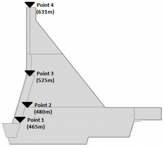 The distribution of material properties throughout the Guxian dam body is illustrated in Figure 6a. While Figure 6b presents a 2D model of the Guxian dam. Level constraints were applied to the upstream and downstream boundaries of the foundation, while the bottom boundary of the foundation was assigned a fixed constraint. The boundaries of the dam body were designated as free boundaries. Four monitoring points at the dam cross section were determined as the fixed points of dam displacement measurements, and the elevations of these points are 631 m (dam crest), 525 m, 480 m, and 465 m, as shown in Figure 7. The displacement of the dam body was recorded at these points at different strength reduction factors. The assessment indicators of the dam displacement and the connectivity of yield zones were used to express the safety of the Guxian High Dam in the progressive failure procedure considering the weak layers. In order to simplify the analysis process and to prevent the complexity of the FEM model, the weak interface between the layers of the RCC dam was taken every three meters in the current model with a thickness of 1 m, according to [].