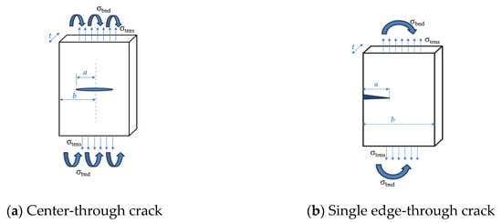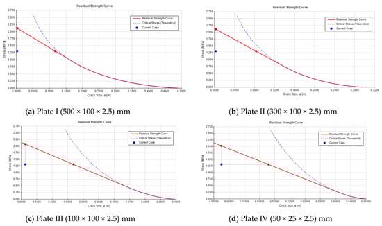 where Y represents a geometry correction factor. The stress σ denotes the gross stress on the section where the crack length a is defined, with the residual strength referring to a net section condition. Under plane strain conditions, Kc = KIC, the crack size corresponding to this stress is known as the critical crack size. Solving the critical crack size analytically is challenging because Y(a) is typically a complex function of the crack length and the component geometry []. However, this can be determined numerically through iteration. When Y changes slowly with the crack length, for example, for a small crack in a wide panel, an approximate value of Y can be used to estimate the critical crack size that a component can withstand under a given load using the following equation: