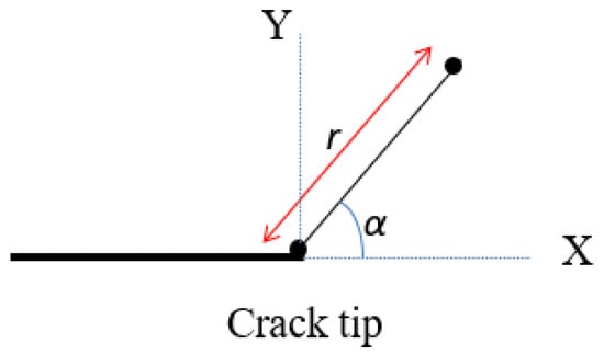 Here (r, α) represent the polar coordinates centered at the crack tip, the variable r denotes the distance from an arbitrary point to the crack tip, while α is the angle between the X-axis and this point. See Figure 9 for an illustration. These coordinates describe how the stresses vary with both the distance from the crack tip and the angular displacement from the X-axis.