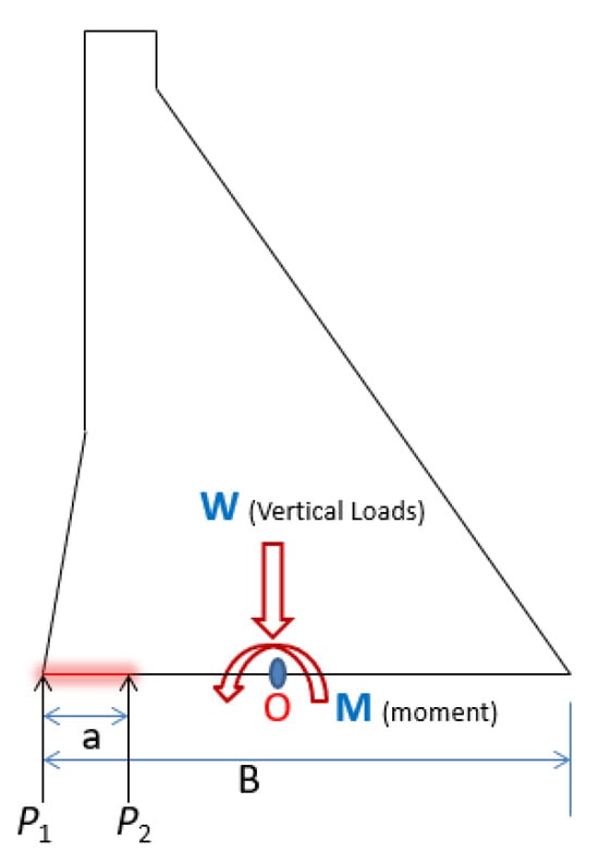where is the normal stresses on horizontal planes on the upstream face, and is the normal stress on the downstream face. According to the requirements in the code for the design of gravity dams [], with ∑M counterclockwise as positive and ∑P gravity direction as positive, the normal stresses can be calculated at the dam heel as follows:
