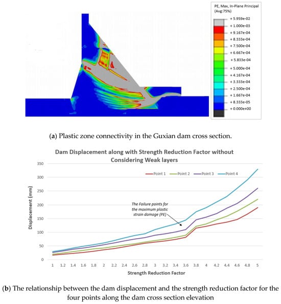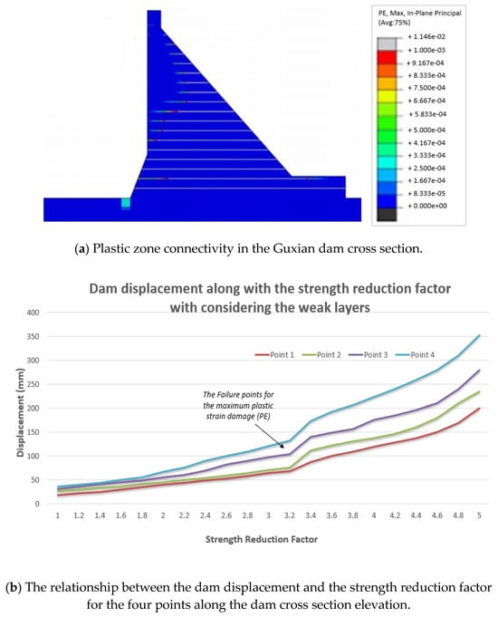 Dam displacement and connectivity of the plastic yield zones were used as indicators of the dam progressive failure with and without considering the weak layers of the RCC dam. It has been noticed that the mode of failure has changed after considering the weak interfaces of the RCC dams, and the safety factor has dropped noticeably from 3.8 to 3.4 in the case of considering these weak layers (see Figure 11a and Figure 12a). The ultimate strength reduction ratio is considered the safety factor (or strength reserve coefficient) and is obtained when the penetrating plastic zone appears and is fully connected, and the structure is destabilized through the gradual reduction of the shear strengths of the soft interlayers. Due to the existence of the stream direction for the horizontal weak interlayer, the yield zones first appeared at the dam toe. When the reduction parameter reaches values of more than 3.4, in the case of considering the weak layers (see Figure 12a), the connectivity of the plastic zones is formed at the dam toe, namely the potential downstream sliding surface is developed. With the continual increments of the reduction parameter, the yield zones rapidly extend towards the upstream direction. It can be noticed that, when the strength reduction parameter is less than 3.4, the displacement of the selected four typical points remains almost constant (see Figure 12b), with only a slight increase noticed, and the plastic yield zones only cover a smaller area of the dam cross section. The semi-constant line in the relationship between the dam displacement and the reduction factor indicates that the dam is still stable. When dam concrete material deformation takes place in a larger area, and in parallel, the dam displacement gradually increases. The explanations may be attributed to the fact that the connectivity of the plastic yield zones in the dam body was not developed completely before the strength reduction factor reached 3.4. When the strength reduction exceeds 3.4, the plastic yield zones largely form in the dam body, which leads to a rapid increase in the deformation at the upper part of the dam that represents failure. The same trend can be noticed for the case of not considering the weak layers, but the dam shows more resistance, and the failure happens at the higher value of safety factor equals 3.8; see Figure 11. That confirms the negative impact of the weak layers on the dam safety. The results clearly showed that the presence of weak layers significantly reduces the dam’s safety. Specifically, the safety factor decreased from 3.8 to 3.4 when the weak layers were considered, corresponding to the point of maximum plastic strain and full connectivity of the plastic zones in the dam cross section. This reduction highlights the destabilizing effect of construction-induced interfaces. These findings are consistent with those reported in [], which demonstrated that the presence and positioning of weak layers significantly influence the damage characteristics and failure modes in concrete dams. The observed agreement further validates the importance of incorporating weak layer effects into dam safety evaluations.