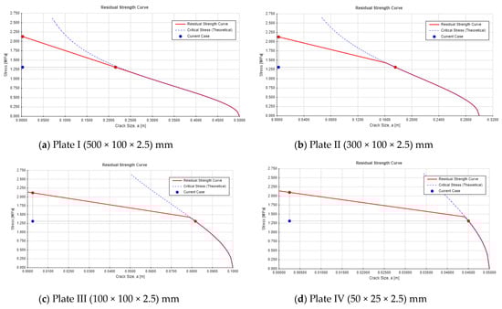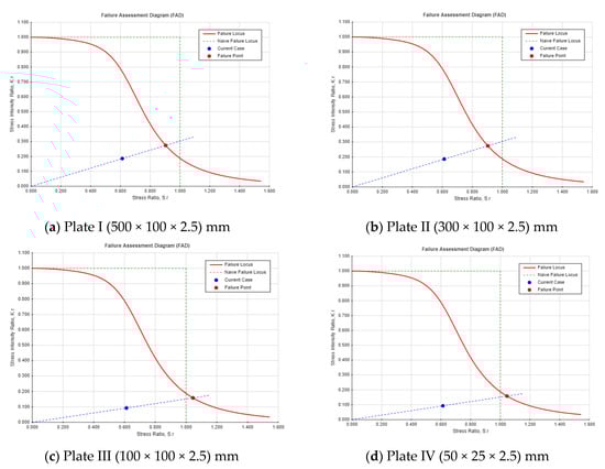 If the LEFM is not applicable, an elastic–plastic analysis based on the failure assessment diagram (FAD) is required to account for the plasticity effects around the crack []. The applicability of the LEFM was assessed based on the relative size of the plastic zone at the crack tip to the uncracked ligament and plate dimensions. When the calculated plastic zone rt exceeded approximately 10% of the remaining ligament width, the LEFM was deemed invalid. A FAD is a graphical method used to evaluate the integrity and safety of structures with cracks or defects, combining both the fracture and the plastic collapse failure modes. By plotting the material’s response on the FAD, engineers can assess whether the structure is safe or at risk. The FAD helps determine design acceptability by comparing the applied loading conditions with the material properties, like fracture toughness and yield strength. Both the stress ratio (Sr) and the stress intensity ratio (Kr) must be calculated to assess the design’s safety under specific load cases, as follows: